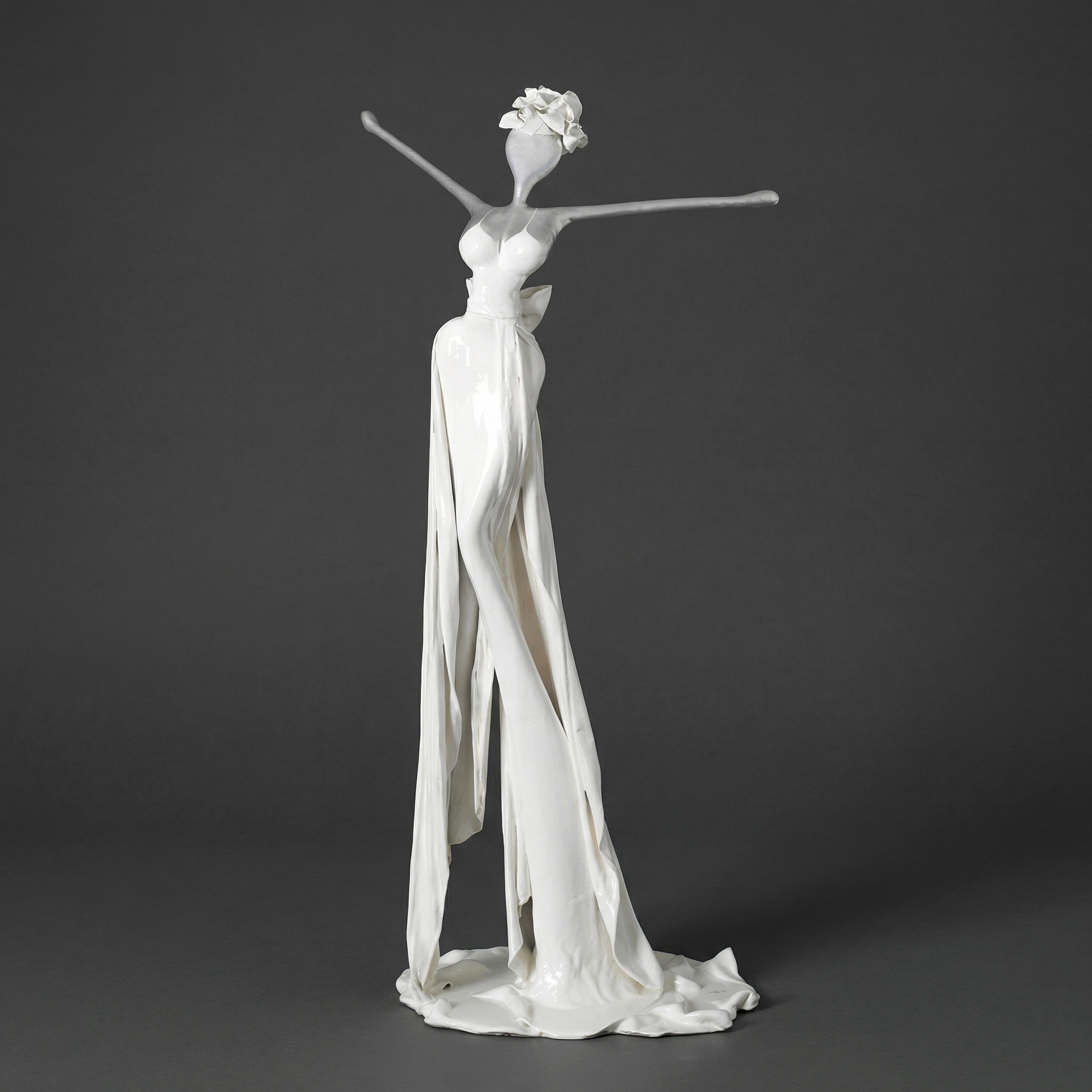 Each sculpture has its own personalised robe. Here, the fine fibreglass fabric is sewn and draped with needle and thread. When the fibreglass is impregnated with resin, the details have to be observed over a long period of time to ensure that the shape is retained. As soon as the sculpture is finished, Mercedes Welte paints it white. The rest of the colour process is then built up.