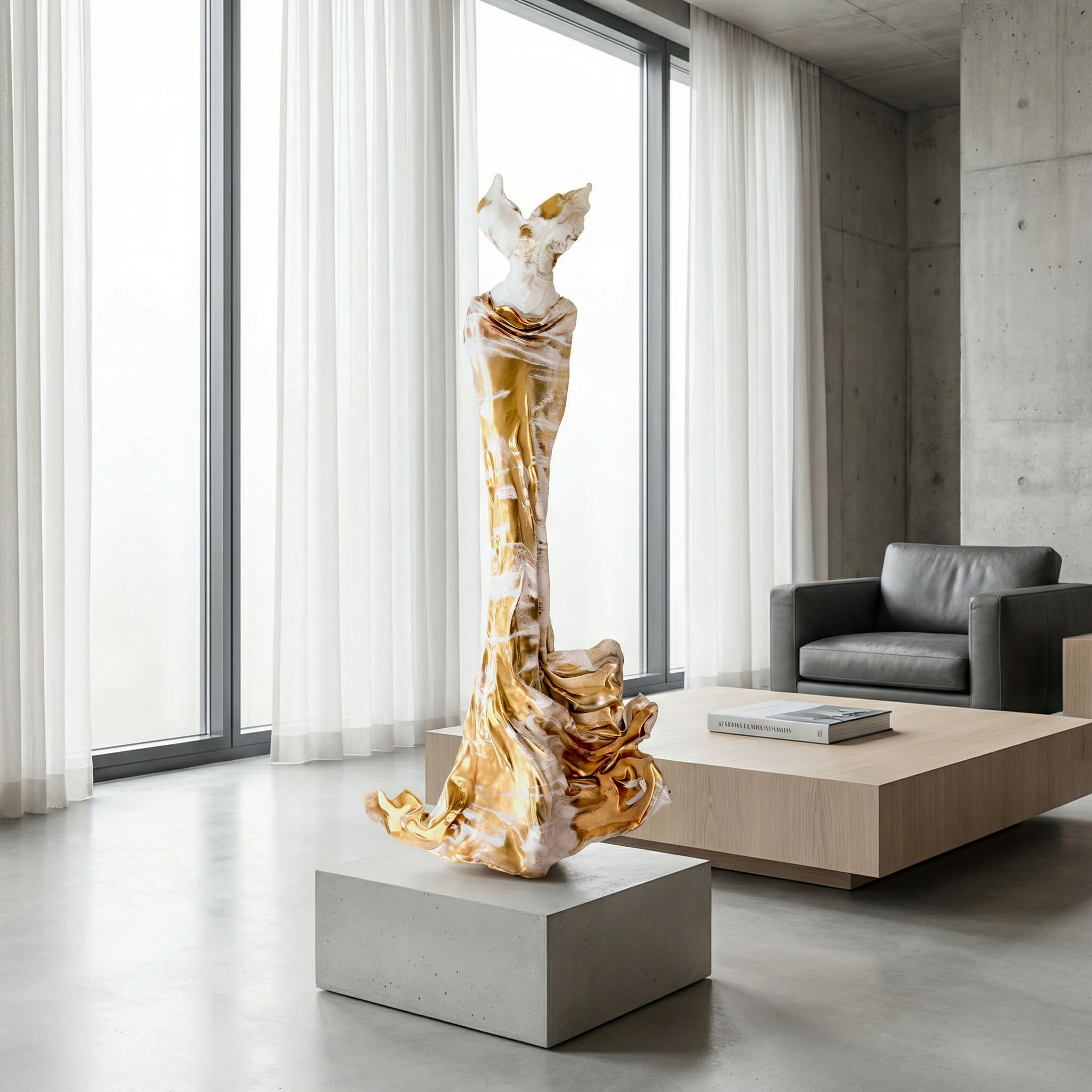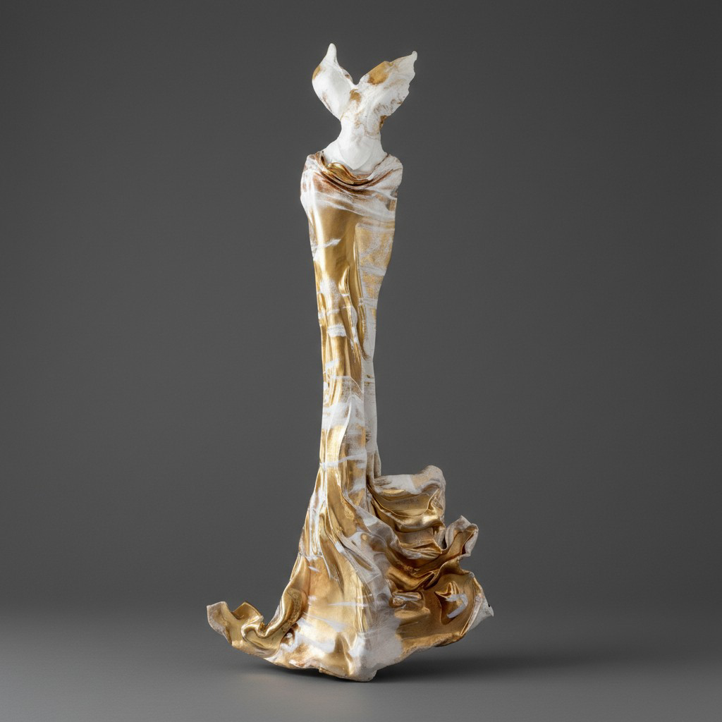 Anklänge an antike Skulptur und klassische Draperie fließen ein, ohne direkt zitiert zu werden.