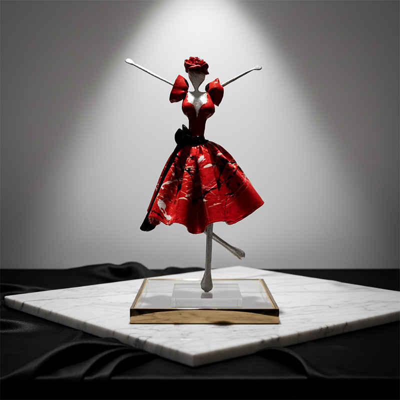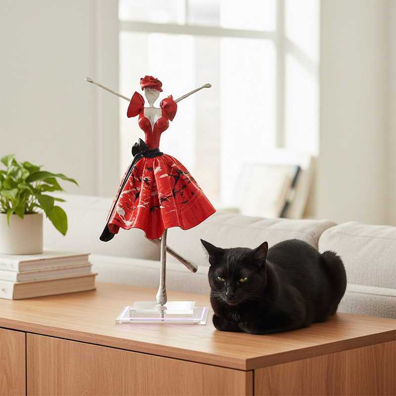 Die dynamische Pose, der kunstvoll drapierte Rock und die ausdrucksstarke Haltung machen diese Figur zur Hommage an die Weiblichkeit – selbstbewusst, verspielt, nicht zu bremsen.